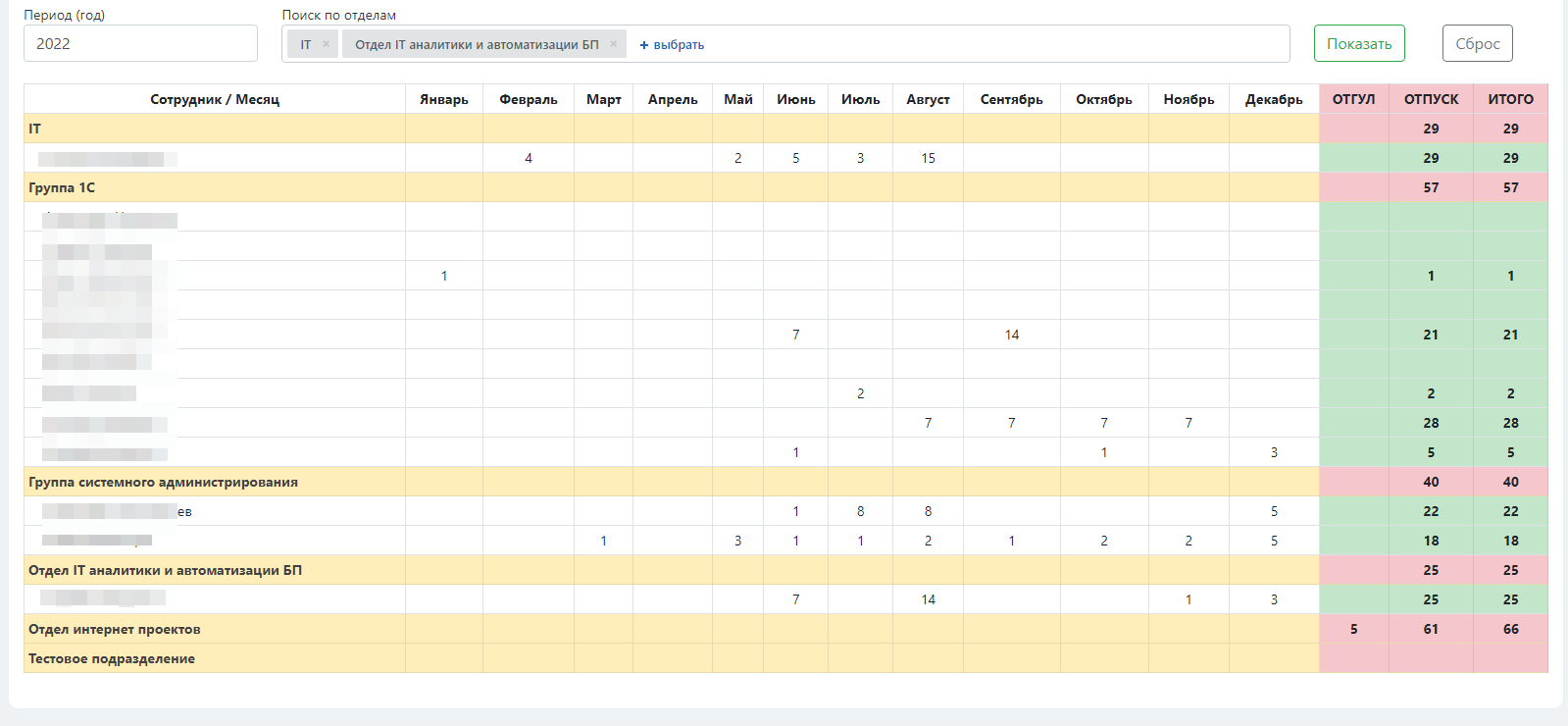 Отчет можно формировать как по сотрудникам, так и по отделам.