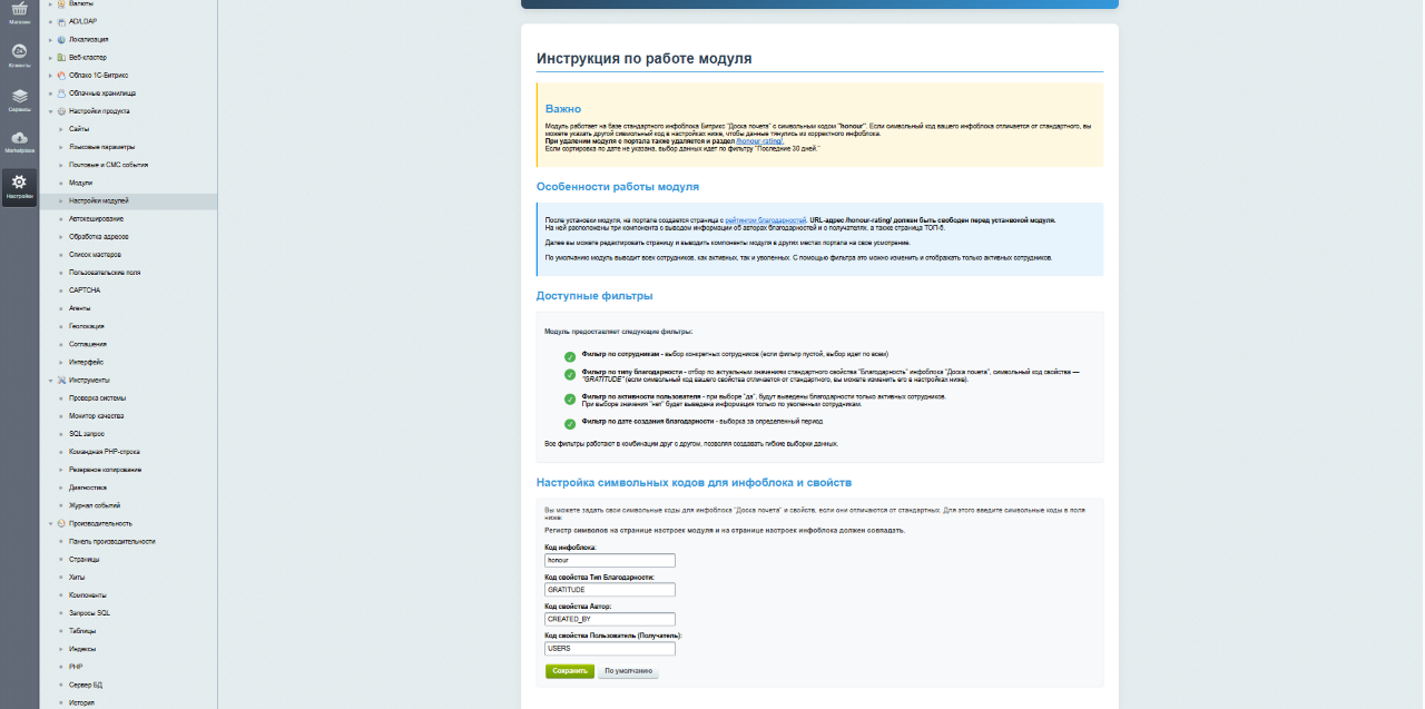 Если на портале используется другой символьный код инфоблока или свойств, их можно указать в настройках модуля.