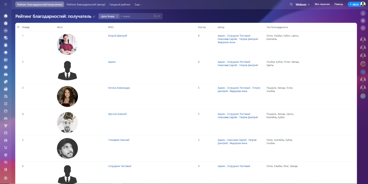 рейтинг получателей благодарностей;