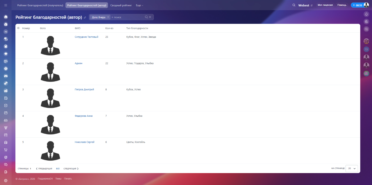 Рейтинг благодарностей — это модуль для Битрикс24, который формирует прозрачную систему признания сотрудников на основе данных инфоблока «Доска почета».