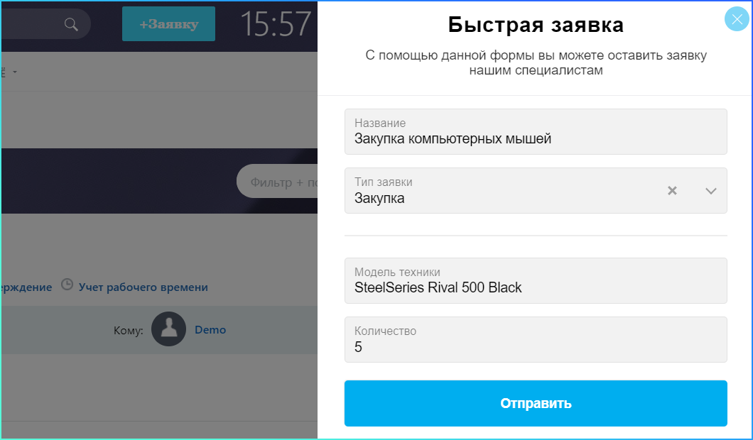После установки и настройки модуля, в верхней части портала появится кнопка +Заявку, которая доступна для всех сотрудников на портале.