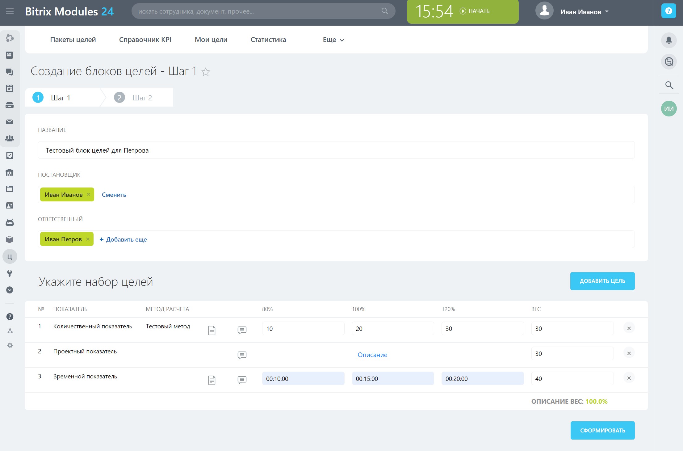 - Формирование пакетов из нескольких целей с удобным учетом степени выполнения и веса каждой из них в общем KPI пакета.