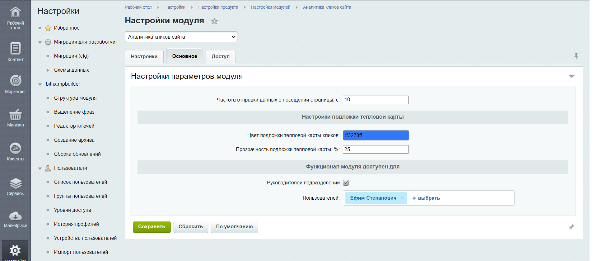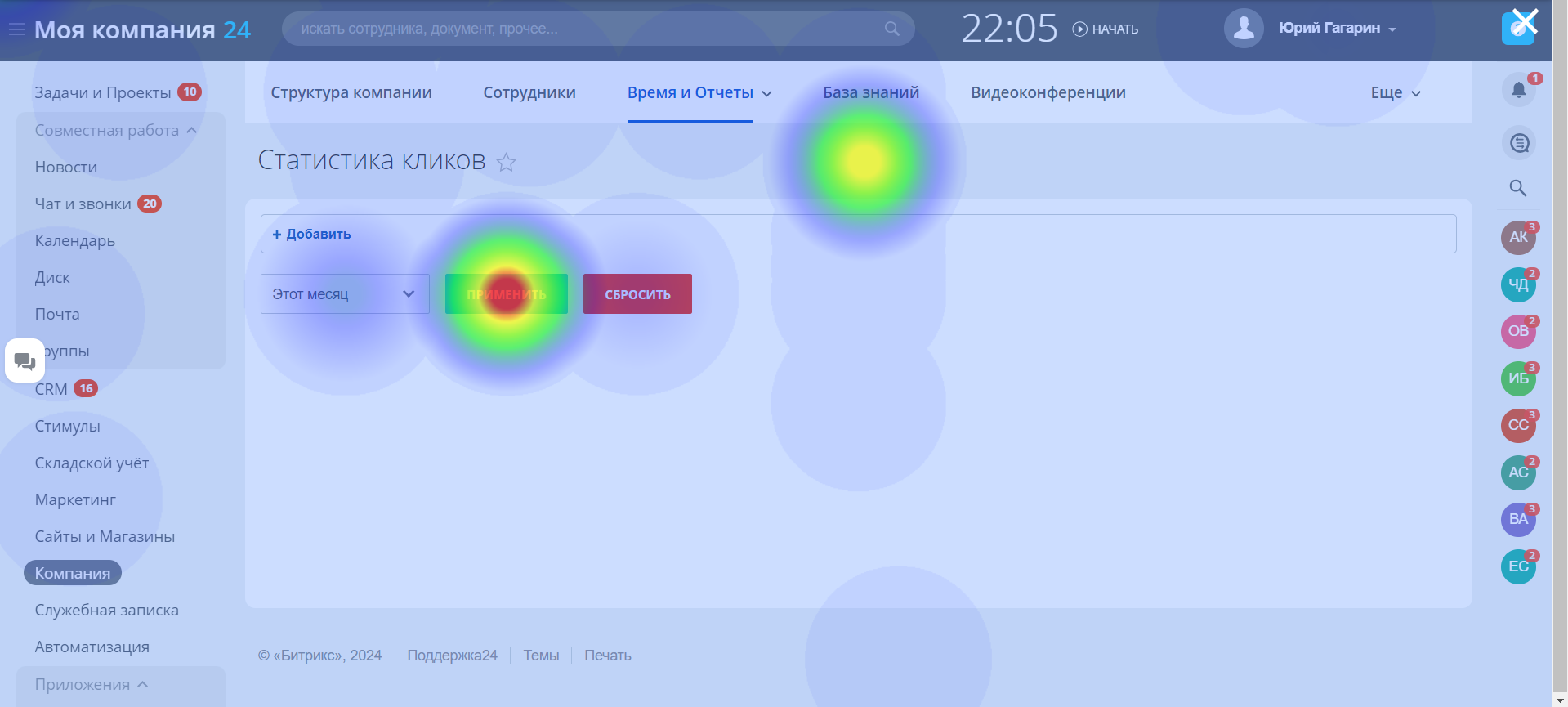 - для сайта с лицензией Битрикс24 - по данным выбранных пользователей. Реализована логика просмотра тепловой карты для руководителей подразделений: данные сотрудники могут видеть тепловую карту кликов, построенную по данным сотрудников, подчиненных им и находящихся в их подразделении, а также руководителей нижестоящих подразделений.