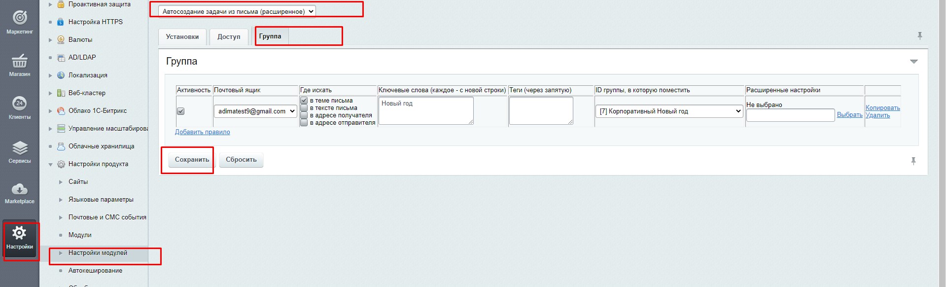 Все задачи создаются с привязкой к группе. Распределение по группам происходит в соответствии с правилами, которые указываются в настройках модуля. В правилах нужно указывать набор слов и группу, к которой следует отнести задачу, в тексте которой упоминаются эти слова. Количество правил не ограничено.