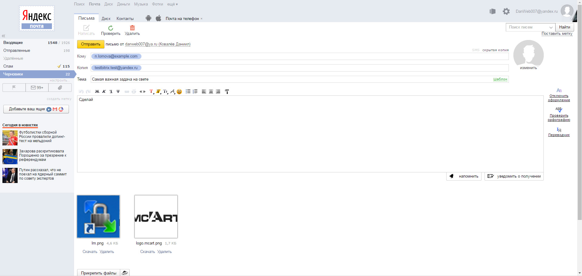 — пользователи портала, чьи электронные почтовые адреса вы укажете в копии письма, будут поставлены соисполнителями в задаче;