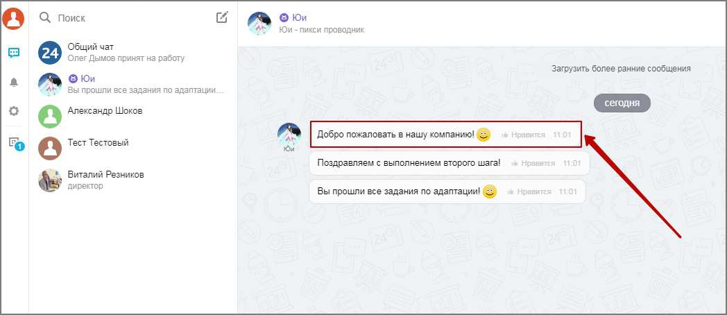 Модуль «Чат-бот для отправки уведомлений пользователям» позволяет настраивать отправку сообщений в чате корпоративного портала новому сотруднику, который проходит пункты автозадачи по шаблону для новых сотрудников.