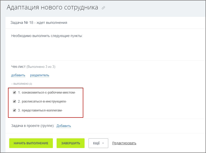 То есть, при прохождении определённого количества пунктов чек-листа автозадачи вы можете настроить отправку сообщения сотруднику.